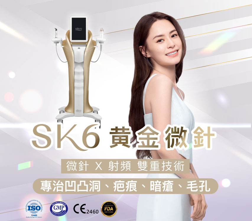 SK6黃金微針療程獲美國FDA、歐盟CE、韓國KFDA 認可,可以處理毛孔粗大、膚質改善、嚴重凹凸洞及皺紋。